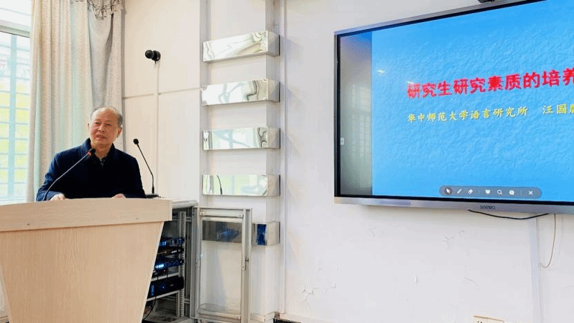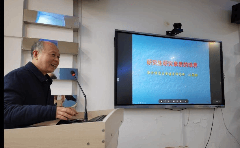 ,为师生带来了题为“研究生研究素质的培养”的讲座。讲座由陈山青教授主持,我院语言学及应用语言学、汉语言文字学专业师生及语言学爱好者现场聆听了讲座。