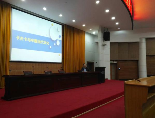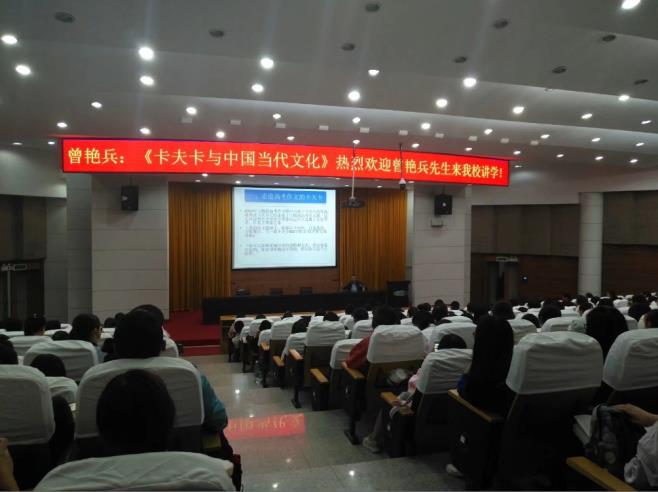 2017年10月27日晚7时,逸夫楼一报,卡夫卡学著名学者,中国人民大学曾艳兵教授登上“湘大韶风名家论坛”,与400多位师生畅谈“卡夫卡与中国当代文化”。讲座由宋德发教授主持,沈云霞、熊毅等老师现场聆听了讲座。