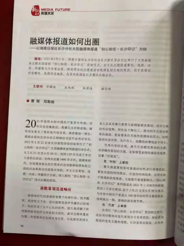 湖南日报社长沙分社社长、我院新闻传播专业硕士生导师曹辉与研究生邓斯昶合著的论文《融媒体报道如何出圈》刊发专业核心期刊《新闻战线》2021年第8期。