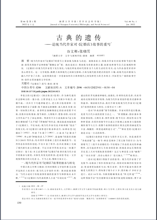 谷文彬副教授论文《古典的遗传——论现当代作家对<定婚店>故事的重写》刊发CSSCI期刊《湘潭大学学报》