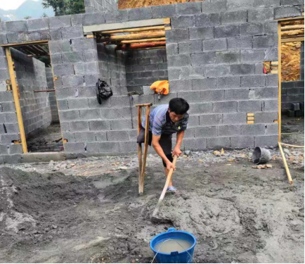 我从山上砍下树,扛着去工地,用来搭屋顶的架子;房子墙壁要用水泥,我就用单拐当支撑点,腿架在上边,倒水、搅拌,把灰沙变成水泥。