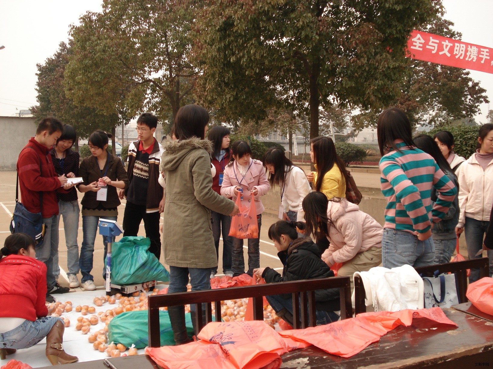 3月5日上午,由于运输柑橘的货车的原因,义卖推迟了半个小时,焦急地等待后,柑橘终于运到,兴湘学院的青年志愿者们各就各位,在各个点忙碌开来。这次义卖的主要人员为兴湘学院的实践部及部门下的青年志愿者,此外,05、06、07级的各个班级轮流参加义卖。